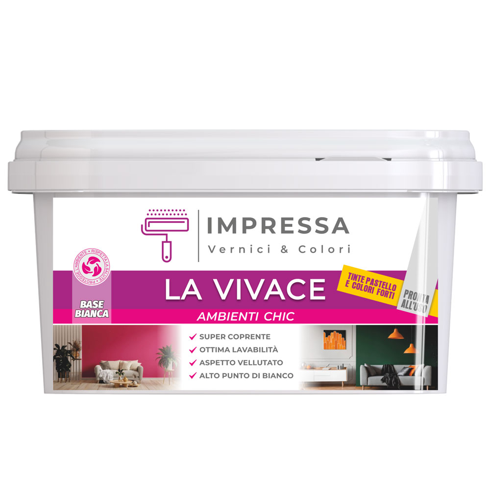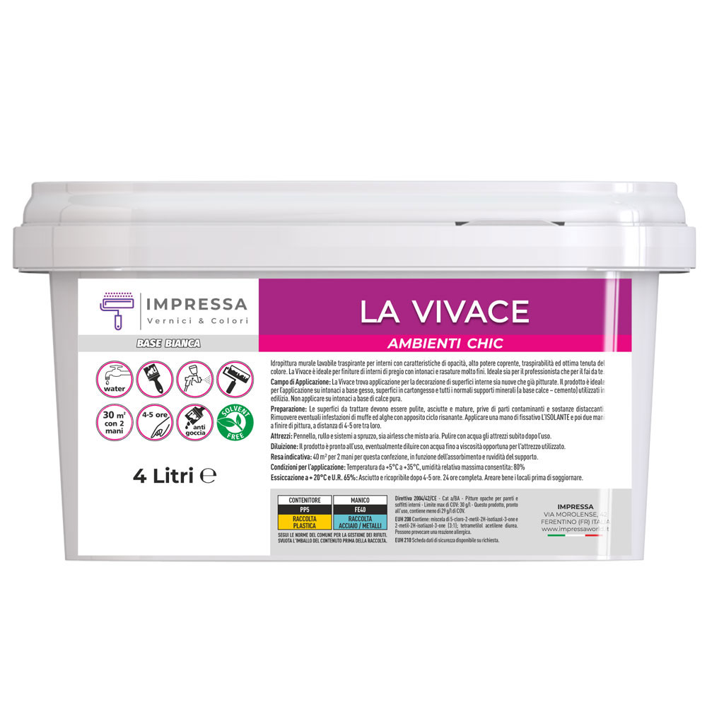 Idropittura murale lavabile traspirante per interni con caratteristiche di opacità, alto potere coprente, traspirabilità ed ottima tenuta del colore. La Vivace è ideale per la finitura di interni di pregio con intonaci e rasature molto fini. Ideale sia per il professionista che per il fai da te.